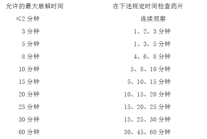 崩解儀的6個(gè)管子中,按下列時(shí)間表檢查崩解情況。